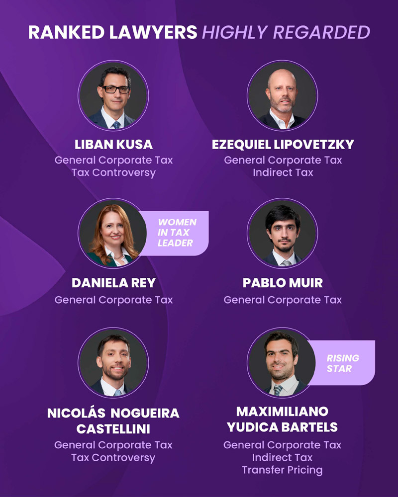 Partners Liban Angel Kusa, Ezequiel Lipovetzky, Daniela Rey, Nicolás Nogueira Castellini and Pablo Martín Muir, have also received individual recognitions as Highly Regarded together with Expert Counsel Maximiliano Yudica Bartels who was recognized as Rising Star.